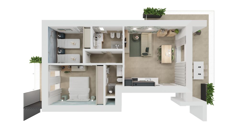 Un corridoio separa l’area giorno dalla zona notte, al quale si affacciano due camere da letto e due bagni.